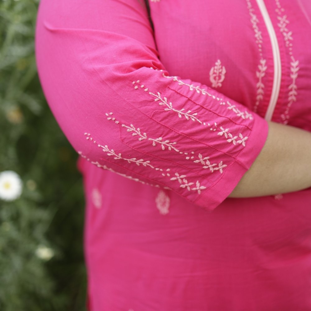 Artisanal Sleeve Work: The quarter-length sleeves are a work of art, featuring a sophisticated combination of hand-done pintucks with delicate Chikankari embroidery nestled perfectly in between.